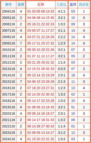 一区奖号【01-11】:在历年双色球第116期同期奖号中,该区开出率为31.75%,表现一般,与理论概率相近。本期预计该区出号2枚,推荐出号关注:03、04。