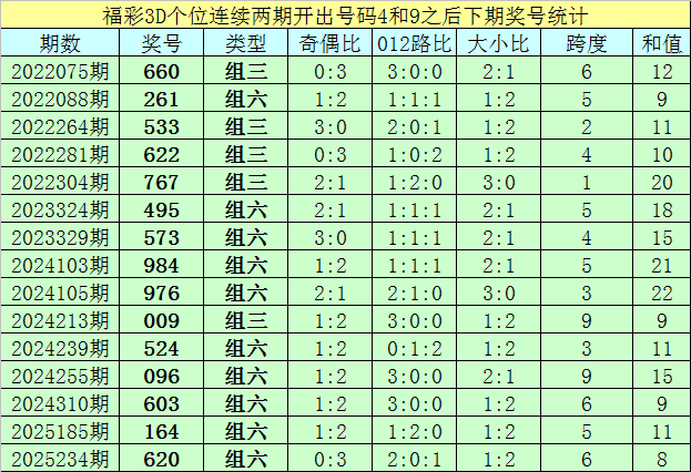 个位号码:最近两期个位开出号码为4-9,在福彩3D历史开奖中,前后两期个位分别开出号码4-9的奖号出现了93次。最近15期个位4-9组合出现之后,其下期奖号分别为:660-261-533-622-767-495-573-984-976-009-524-096-603-164-620;