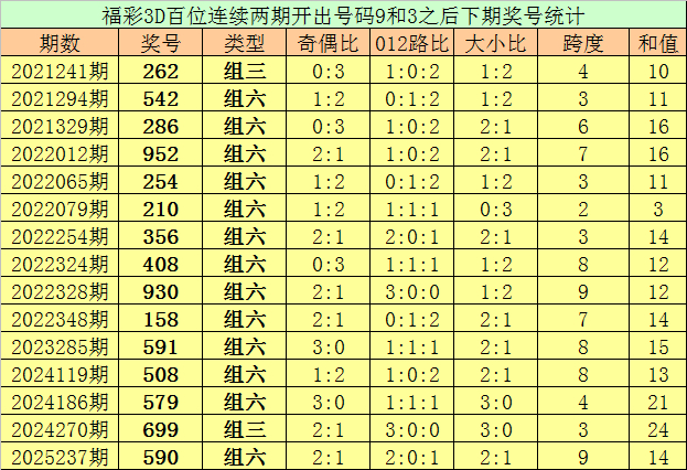 上期回顾:第2025263期福彩3D奖号为399,奖号特征为:组三,奇偶比3:0,012路比3:0:0,大小比2:1。