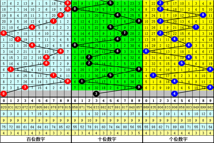 百位号码:连续两期百位出号分别为:9-3,历史上福彩3D连续两期前后分别出号9-3的奖号共出现88次。在百位9-3的奖号现象出现时,近15期下期分别出号:262-542-286-952-254-210-356-408-930-158-591-508-579-699-590;